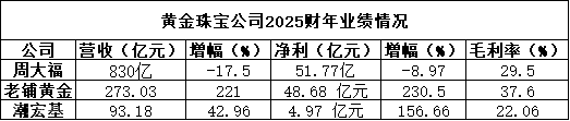 但行业分化加剧:老铺黄金以45家高端门店实现273亿元营收、48.68亿元净利润,单店年化销售近10亿元,净利率约18%,已深度切入奢侈品消费圈层;周大福2025财年营业额达896.56亿港元(约830亿元),是潮宏基的9倍,虽营收同比下降17.5%,但正通过高端化战略提升定价黄金收入(+105.5%)对冲规模收缩。