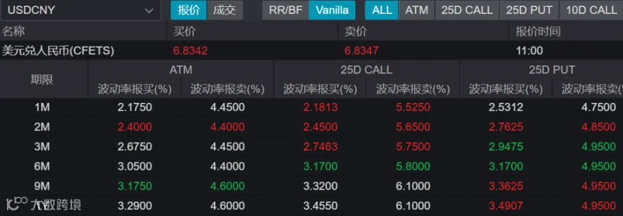 近期人民币快速升值推升期权隐含波动率,1个月USDCNH波动率曾创2025年7月以来新高。尽管当前有所回落,但绝对水平仍偏高,企业买入看跌期权成本难以承受。