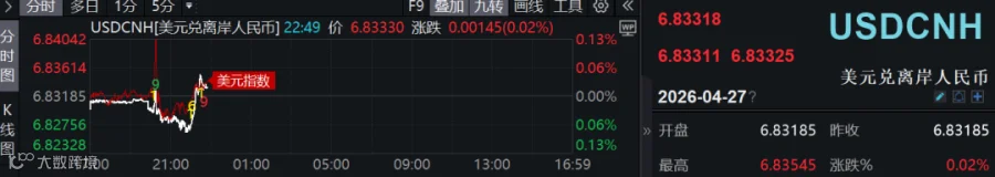 人民币隔夜随美元升至6.83一线,今早盘高点6.8350,短期突破6.80关口。