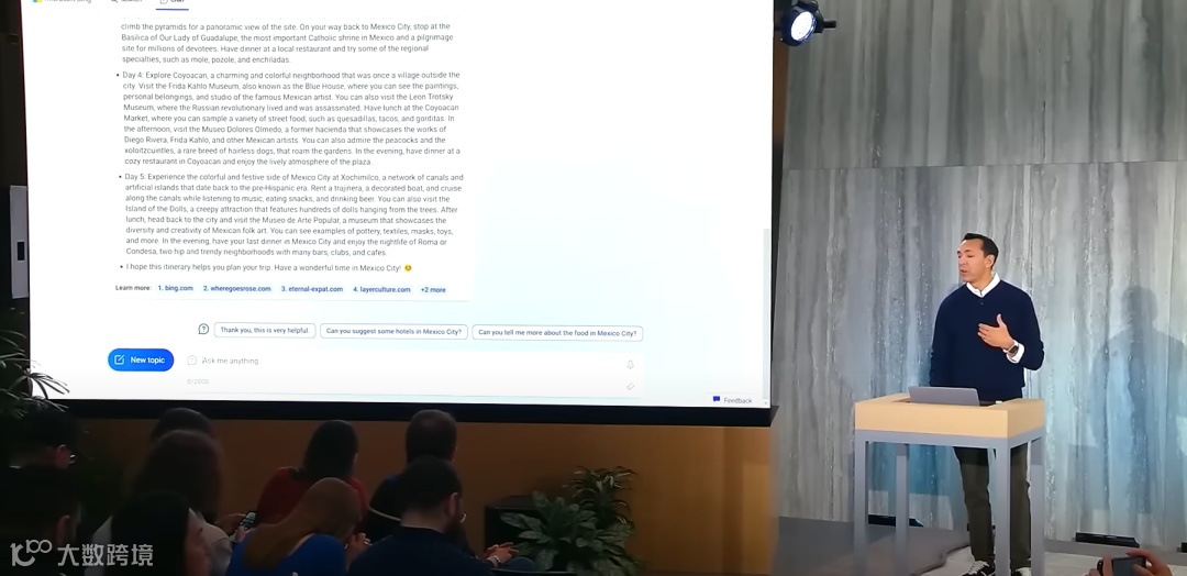 如微软 C 端业务负责人 Yusuf Mehdi 在新版 Bing 发布会上所展示,不再需要繁琐的搜索比较,仅仅是告诉聊天机器人我想要规划 5 天墨西哥城之旅,Bing 直接给出推荐的完整路线规划,包括景点,餐饮,住宿等每个细节的安排。