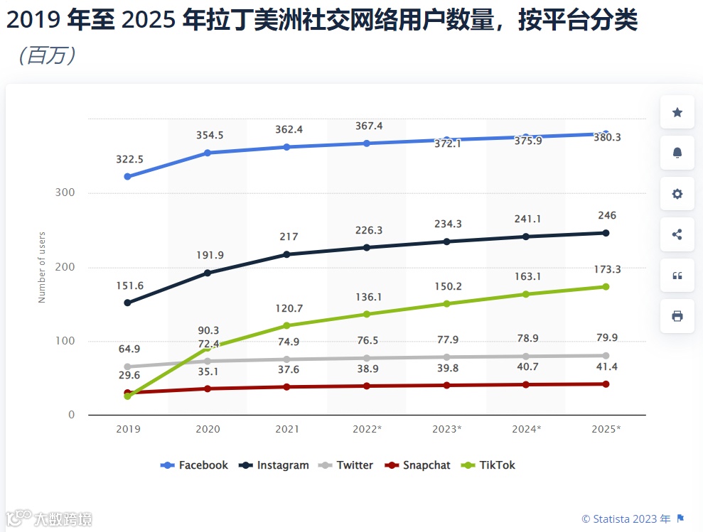 拉丁美洲互联网用户对于社交媒体颇为热爱,据eMarketer数据显示,2022年拉丁美洲将近4亿人使用社交平台,而拉丁美洲一共大致有6亿多人口。