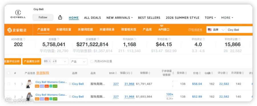 2025年成效初显:高端女装品牌RQ(Rich Radi Q’s)收入近1亿元,同比增长约1.9倍;女鞋品牌Coutgo、休闲女装品牌Tankaneo均突破4亿元;职业女装品牌Cicy Bell在亚马逊美国站近30天预估销量达575.8万单,销售额约2.7亿美元。其中一款售价58美元的职业西装外套,评论数超2万条,长期稳居细分类目第一,自然流量占比显著提升,品牌搜索转化能力初步形成。
