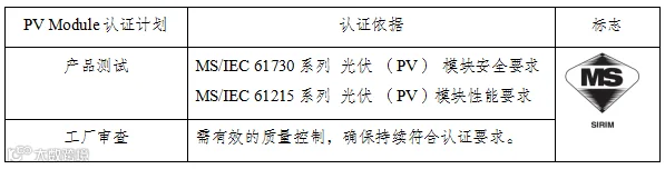 光伏组件认证计划是基于SIRIM QAS的认证实验室出具的光伏组件测试报告再进行工厂生产控制体系审核来完成的,其认证依据和标志如表1所示。