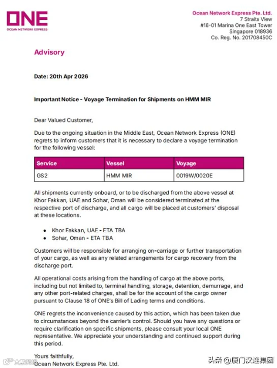 ONE 明确表示,此次中东地区的武装冲突及航道遇袭事件,符合提单条款中关于不可抗力的界定,属于船方免责范围。因此,船公司既不会对损失作出赔偿,也不会承担任何兜底性质的转运安排。