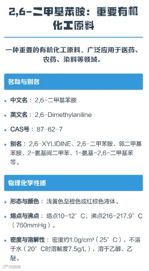 2,6-二甲基苯胺为微黄色液体,相对密度0.973,不溶于水,能溶于醇、醚,溶于盐酸中,是农药、医药及兽药的中间体。