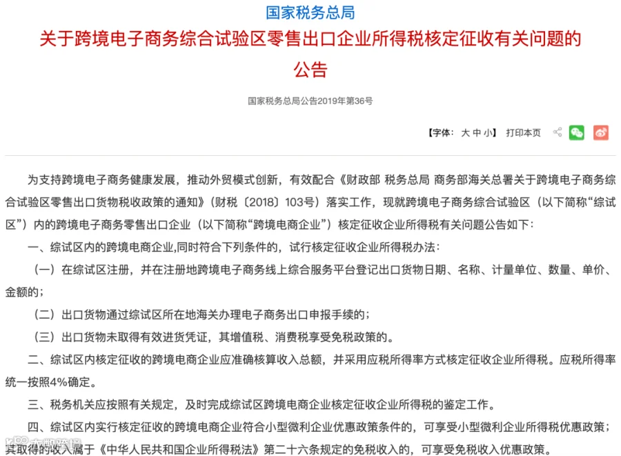 现行有效依据为国家税务总局公告2019年第36号:符合条件的跨境电商综试区零售出口企业,可按应税所得率4%核定征收企业所得税。