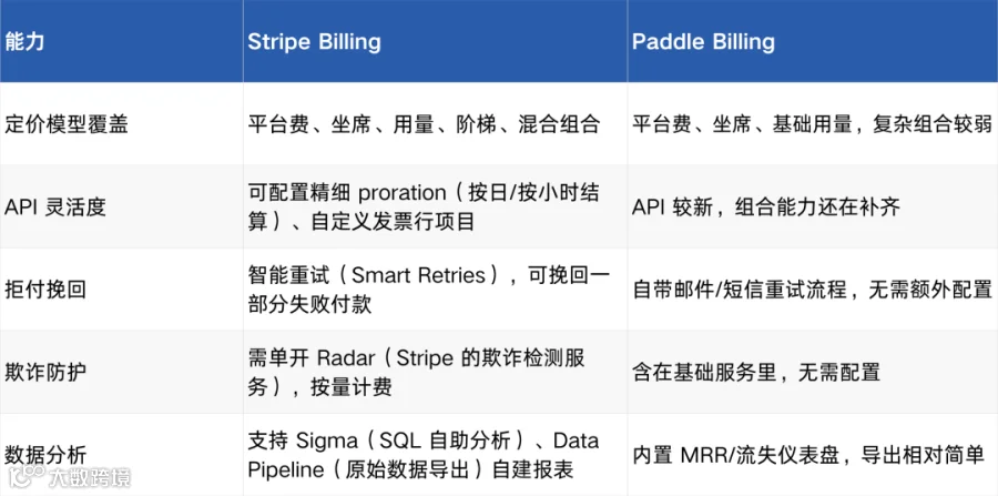 产品能力上,Stripe Billing在复杂订阅模型(如Token计费、坐席+用量混合、阶梯式企业版)支持更灵活,分析维度更深;但中国团队实际落地时,开户路径与结汇方式差异显著。