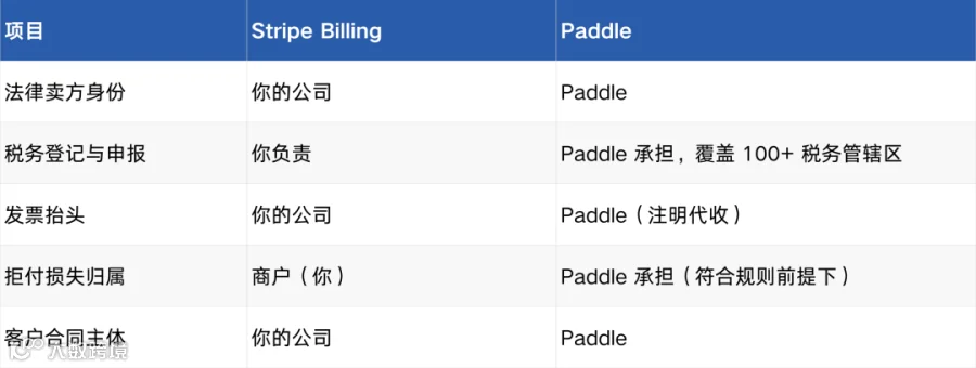 Stripe Billing中,你的公司是法律卖方;Paddle则以自身名义向终端客户销售,承担MoR责任。