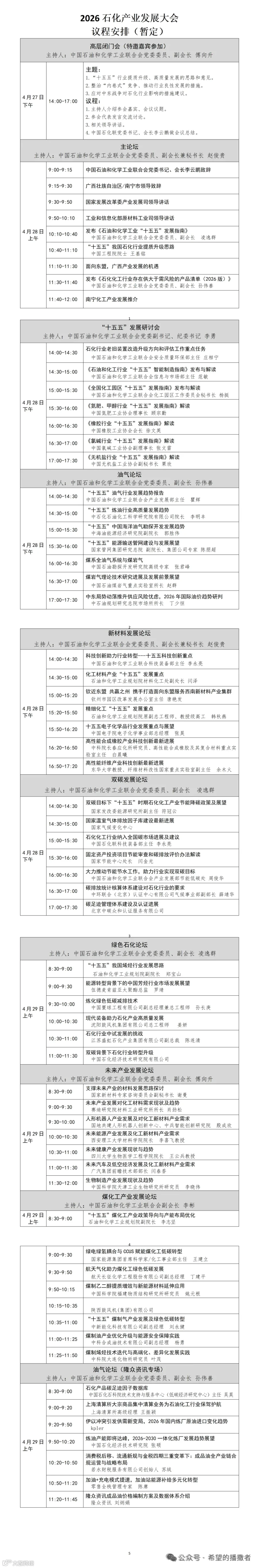聚焦化解行业结构性矛盾、推动老旧装置改造升级、培育新质生产力、提升绿色低碳与数字化智能化水平,重点研讨石油天然气、石油化工等六大领域“十五五”发展趋势。将发布《石油和化学工业“十五五”发展指南》《石化化工行业供大于需风险产品清单(2026年版)》等成果。会议设置主论坛及系列专题论坛: