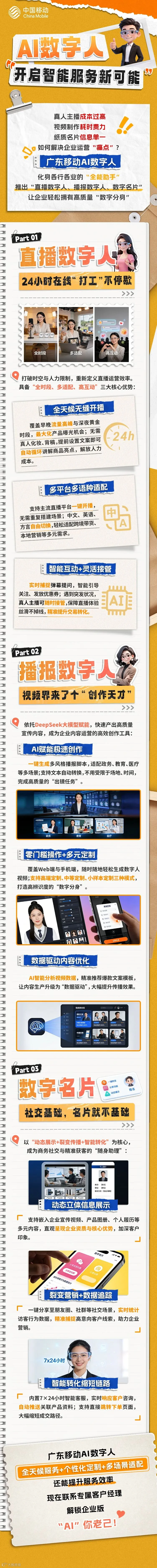 广东移动AI数字人,化身各行各业的"全能助手",推出"直播数字人、播报数字人、数字名片",让企业轻松拥有高质量"数字分身",解决您的企业运营痛点!