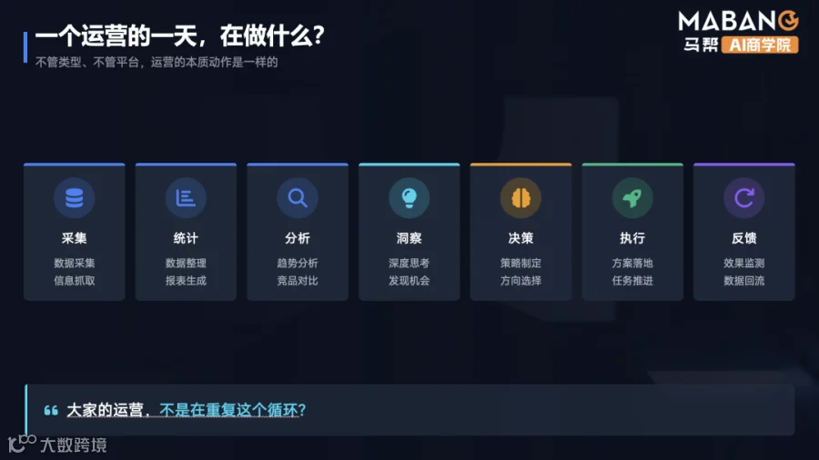 ▲ 运营七步循环:采集 → 统计 → 分析 → 洞察 → 决策 → 执行 → 反馈