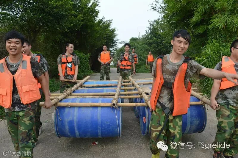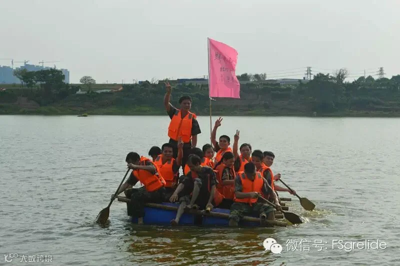教练一开始会将各小队的一名女队员当成人质先带到湖畔的对面,而我们两队剩下的成员要分别使用6个塑胶桶、10根竹竿以及4支船桨在最短的时间内制造出一个简易竹排船,然后全小队成员登船划向湖畔对岸去拯救“人质”并全员安全返回造船点将竹排船分解成最初的样子。通过之前一系列的挑战项目,我们每个小队都已经熟悉了解了身边的每一位队友,在队长的组织带领之下,我们各司其职在短短的5分钟之内完成了竹排船的组装。虽然我们很多队友都没有划过船甚至于部分队员不会游泳,但是在竹排船下水“拯救人质”时,他们还是勇敢的站上了竹排船,这不仅仅只是勇气,更是对身边队友的一种信赖。