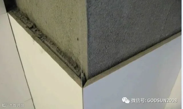 2、阳角两边的瓷砖单边背面倒45°角处理。这样处理的好处在于在于能够有效的使整体墙面比较的协调统一,但是在施工的过程中,砖背面倒45°角切割的时候,不要倒得太薄,这样容易破坏瓷砖表面的釉层,后后期容易出现阳角接缝处瓷砖开裂的问题。