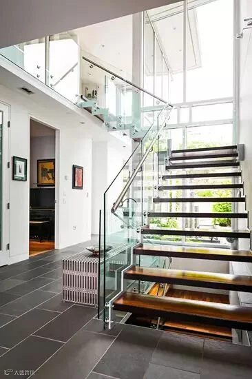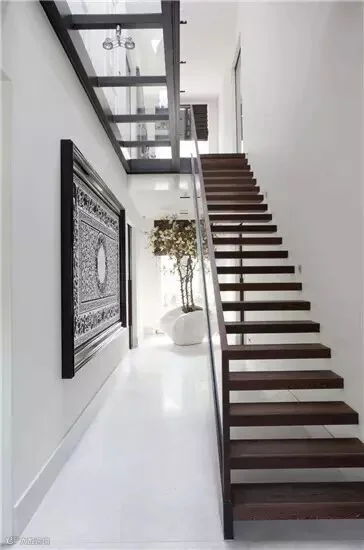 编辑点评:镂空的木质楼梯级扩大了空间感,同时营造出独特的线条感和轻盈质感,再加上玻璃楼梯扶手和玻璃墙的衬托,楼梯空间更加明亮宽敞。
