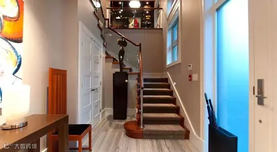 编辑点评:采用转角式的楼梯设计增加了整个空间的利用效果,楼梯下方合理放置白色大柜子,扩展空间的收纳功能。转角处的深色高挑艺术雕塑无形中拉伸了这个楼梯的立体感。整个楼梯空间被利用的恰到好处。