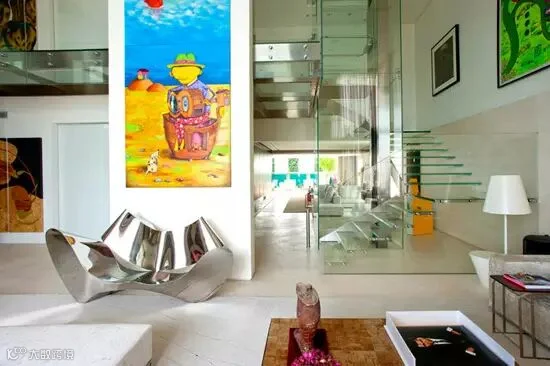 编辑点评:富有创意的玻璃楼梯和楼梯墙隐藏于无形,使客厅空间显得更加宽敞明亮,质感大大提升;异形的不锈钢椅子十分抢眼,让空间充满活力。