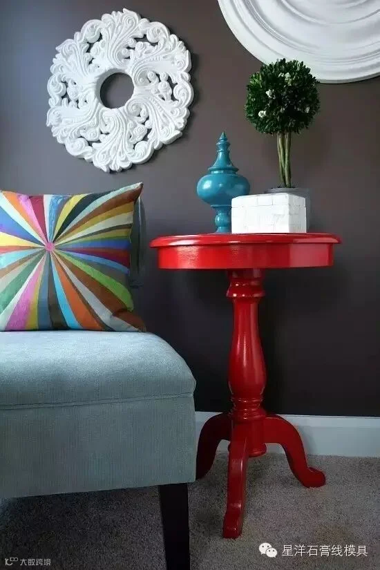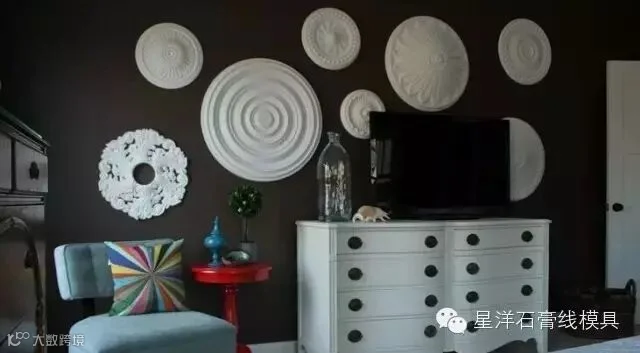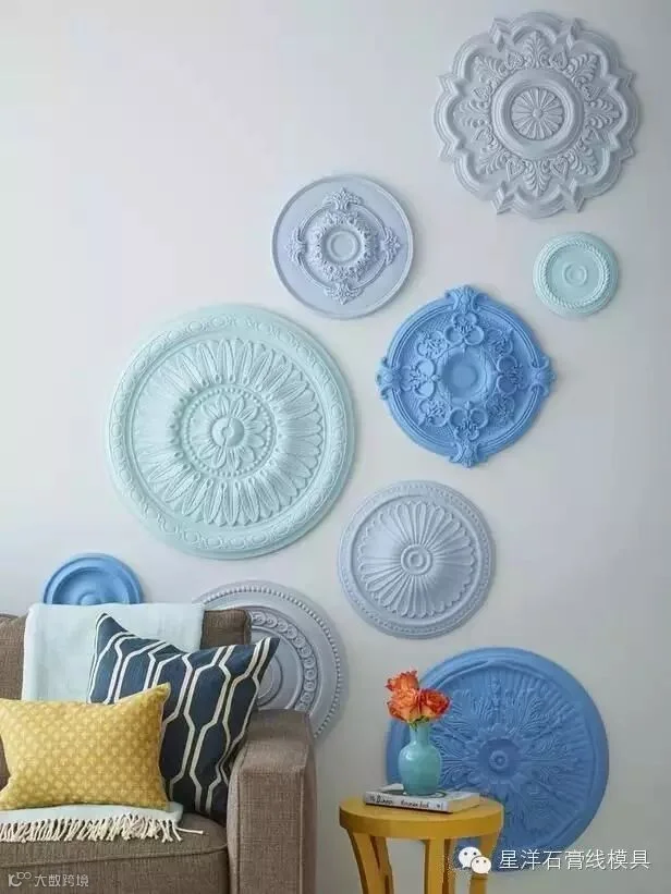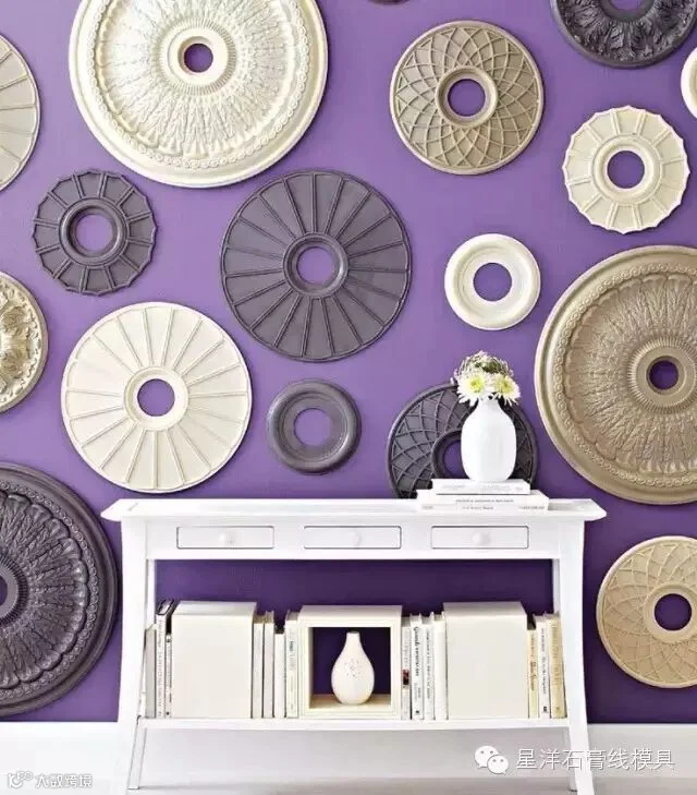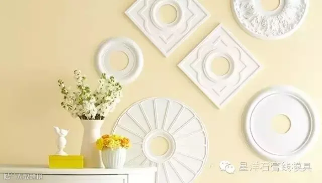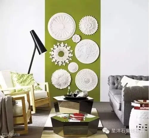 石膏灯盘造型多变、线条优雅,可以根据不同的要求完美搭配各式灯具,是比较常见的家装材料。而恰恰因为石膏灯盘的独特形态,设计们已将其从“天花”转移到了“墙面”,通过不规则的排列和上色,展现出不一样的美。如果你喜欢,也可以在家中试试看!