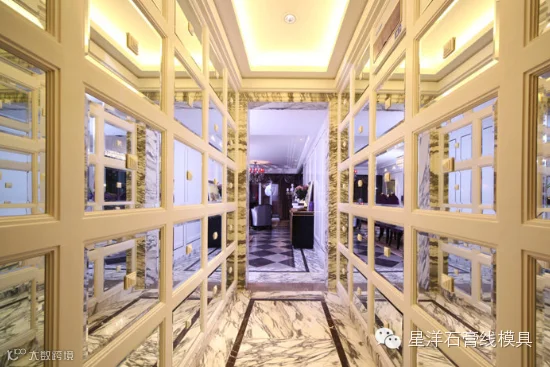 这个走廊是不是给人一种奢华的感觉来呢?这不仅仅是因为墙面上的反光材料的采用,吊顶的石膏线和光线明亮的间接照明的选择也是很重要的。