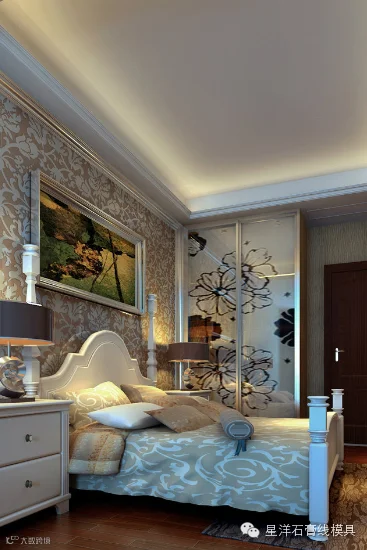 卧室的壁纸和床上用品都采用了一样的图案,为了让整个卧室的设计上不给人一种繁杂的感觉,吊顶的设计就很简洁了。石膏线的设计跟间接照明的配合,就让整个吊顶更具有层次感。