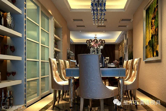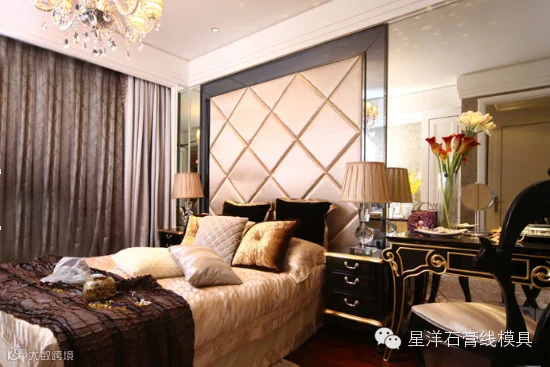 吊顶通过石膏线的设计,跟墙面的装饰采用一样的方式,这就让整个空间都充满了一种古典的欧式设计风格来。同时也让整个空间呈现出一种奢华的感觉来。
