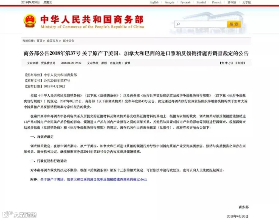 4月20日,商务部网站公布对于原产于美国、加拿大和巴西的进口浆粕反倾销措施再调查的裁定。