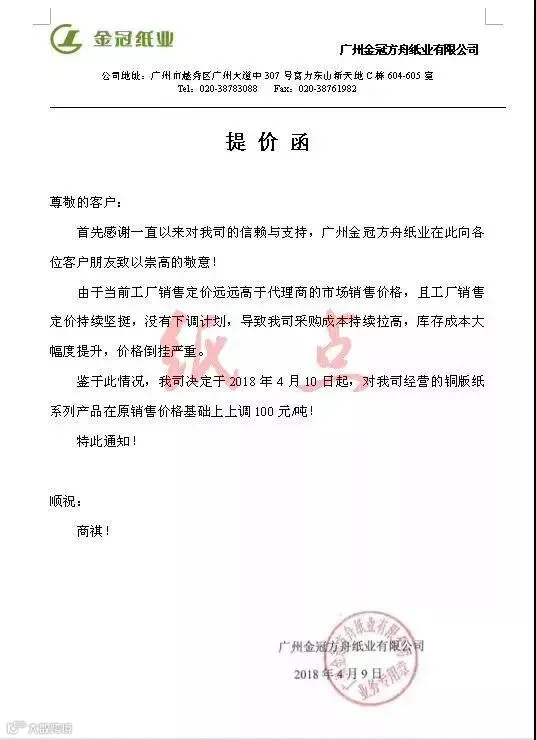 广州金冠方舟纸业:4月10日起,铜版纸上调100元/吨