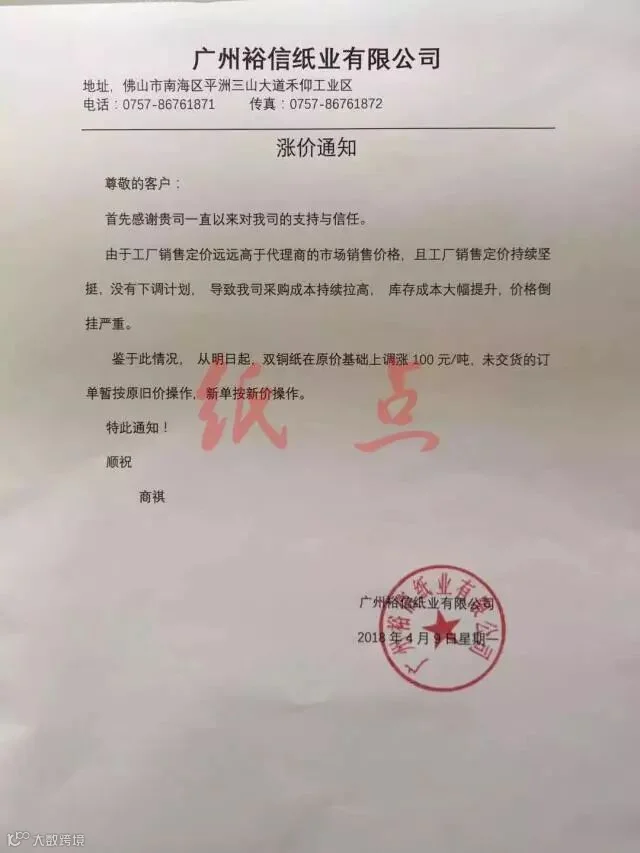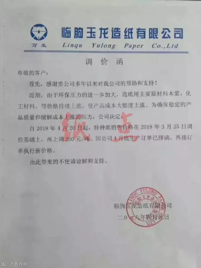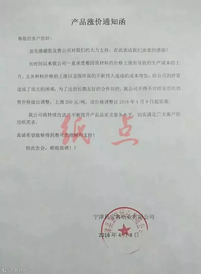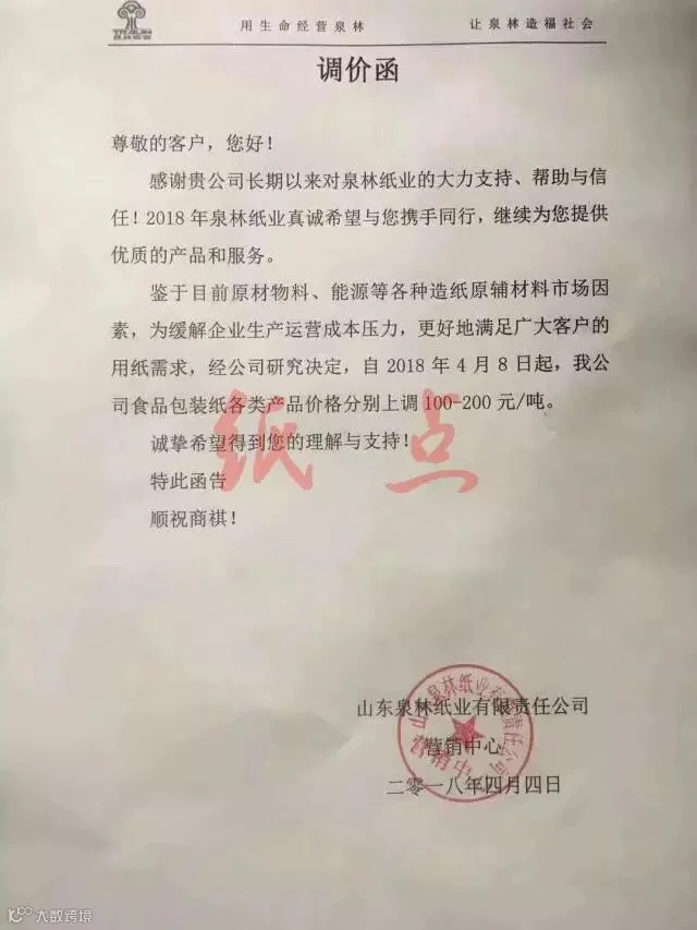 4月8日起,国内多家造纸厂、贸易商、纸板厂发布涨价函,纸种包括文化纸、包装纸、特种纸等,涨价已成燎原之势。详情如下: