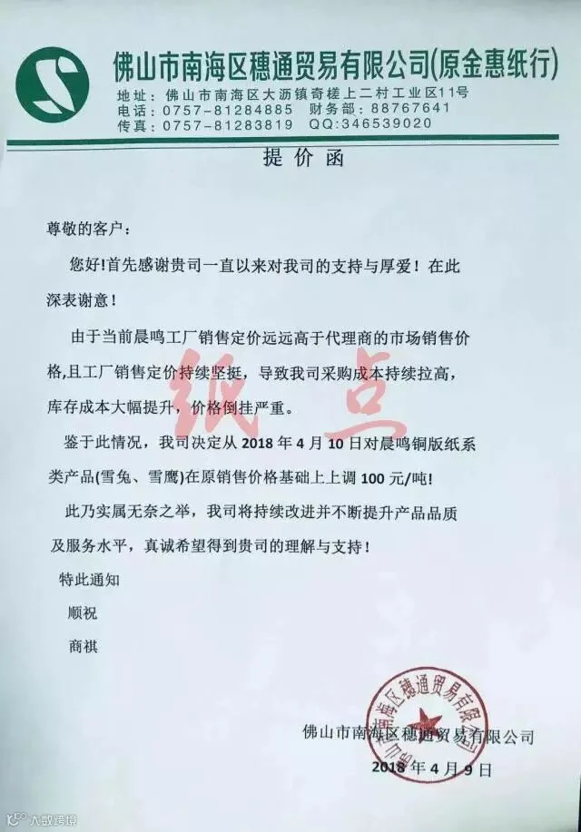 佛山穗通贸易:4月10日起,晨鸣铜版纸上调100元/吨