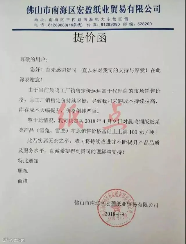 佛山宏盈纸业:4月9日起,晨鸣铜版纸上调100元/吨
