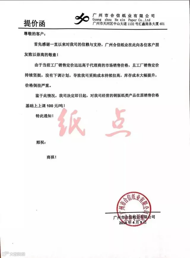 广州合信纸业:4月9日起,铜版纸上调100元/吨