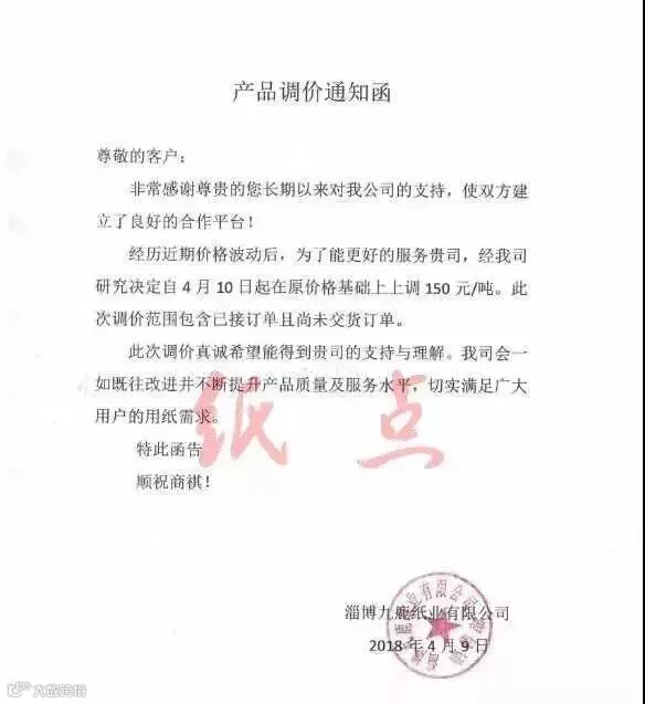 淄博九鹿纸业:4月10日起,上调150元/吨