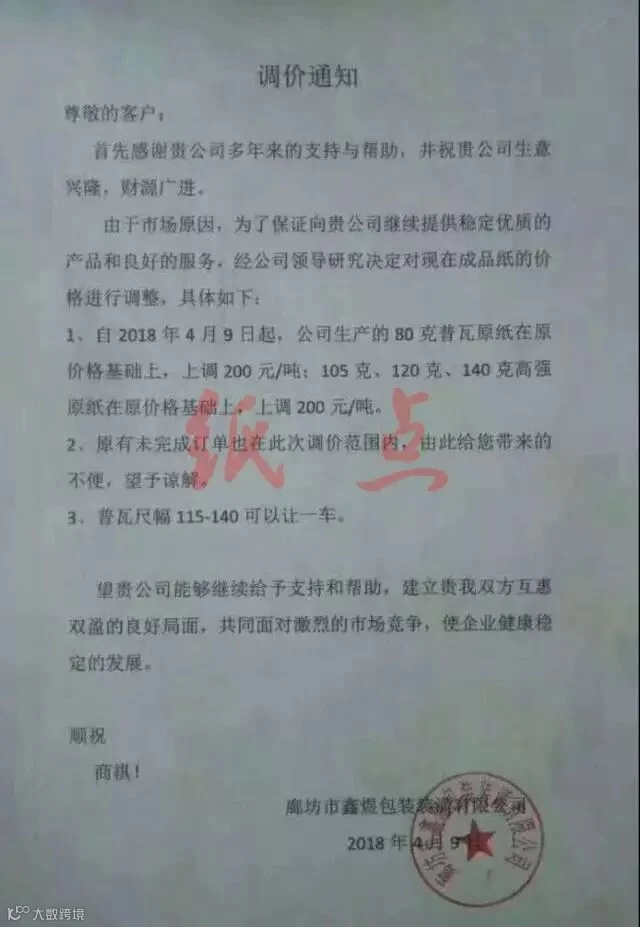 廊坊鑫煜包装:4月9日起,普瓦上调200元/吨