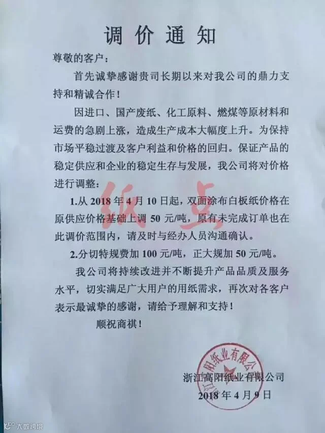 浙江高阳纸业:4月10日起,白板纸上调50元/吨