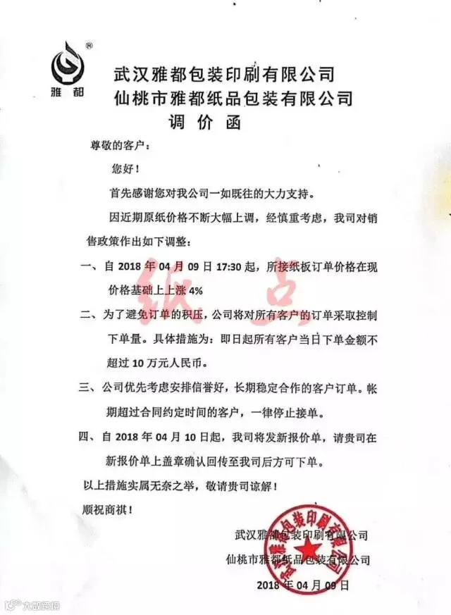 武汉雅都包装:4月9日起,纸板价格上调4%,下单金额不超过10万元