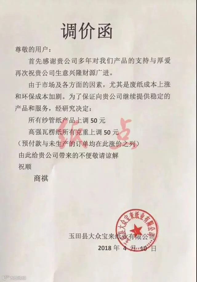 大众宝来纸业:4月10日起,纱管纸上调50元/吨,瓦楞纸上调50元/吨。