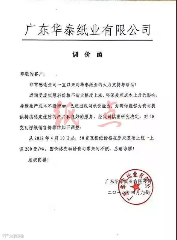 广东华泰纸业:4月10日起,50克瓦楞纸上调200元/吨