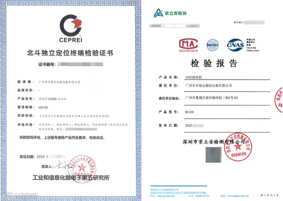 此外,MS100 北斗监测站通过了第三方检测评审,获得了相关证书和报告。