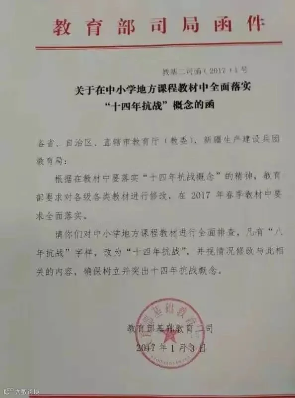 2017年1月,教育部基础教育二司下发《关于在中小学地方课程教材中全面落实“十四年抗战”概念的函》,要求在教材中落实“十四年抗战概念”的精神,凡有“八年抗战”字样,改为“十四年抗战”,教育部已要求对各级各类教材进行修改,在2017年春季教材中全面落实。