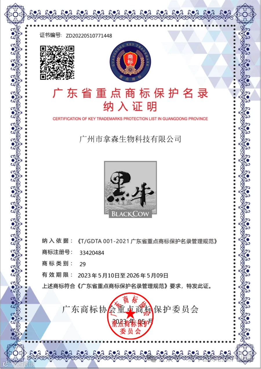 “黑牛BLACKCOW”29类商标注册号33420484、30类商标注册号33420689被纳入《2022年度广东省重点商标保护名录》