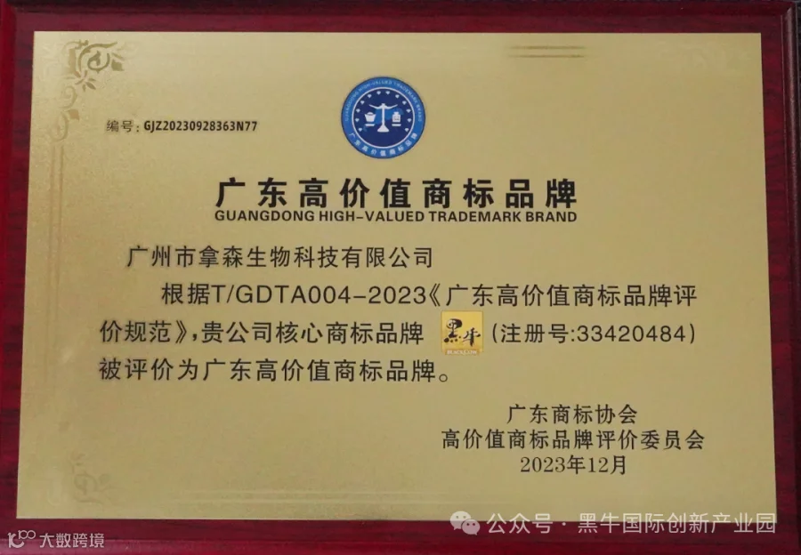 “黑牛BLACKCOW”商标(注册号:33420484)被评为“广东高价值商标品牌”
