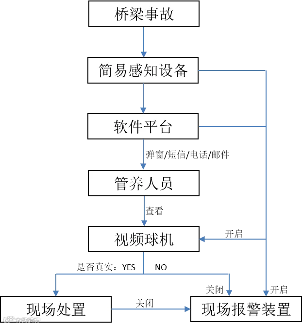 本次中小桥轻量化感知方案硬件配置包括:简易感知设备(GNSS接收机)、视频球机和现场报警装置。联动报警流程如下: