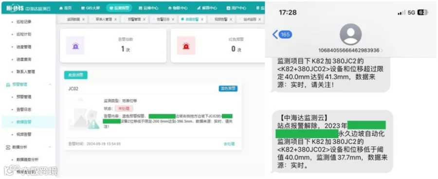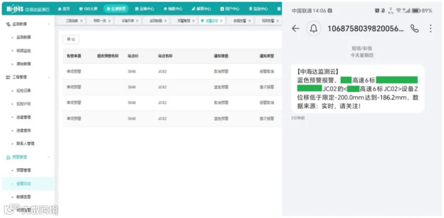 1.短信/监测云平台报警:向管养单位、监测负责人和相关巡检人员发出短信及监测云平台报警。