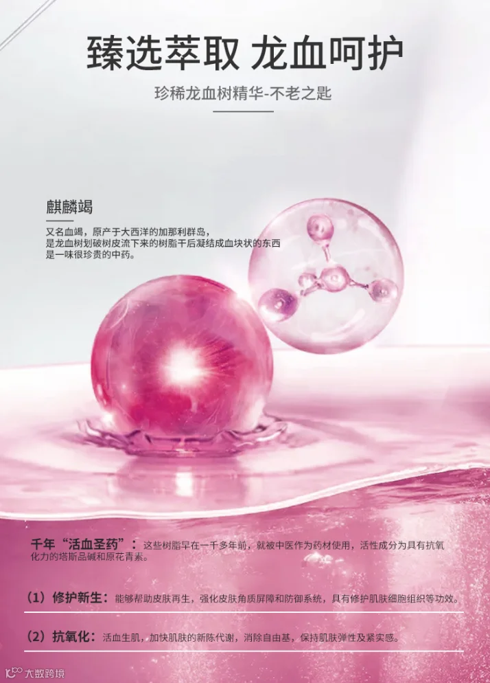 龙血树又名麒麟竭,被誉为“活血圣药”其树龄可高达上千年,拥有跨越世纪的高活性能量塔斯品碱和原花青素,能够赋活疲乏肌肤,能够帮助皮肤再生,强化皮肤角质屏障和防御系统,具有修护肌肤细胞组织等功效;活血生肌,加快肌肤的新陈代谢,消除自由基,保持肌肤弹性及紧实感。