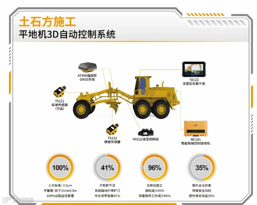 平地机3D自动控制系统是一款根据3D设计文件自动控制铲刀,精准控制坡度,提升施工效率,降低安全风险的辅助施工系统。