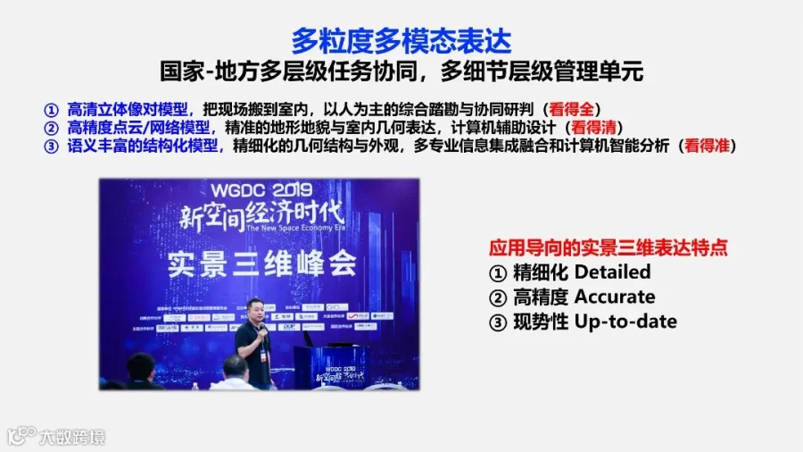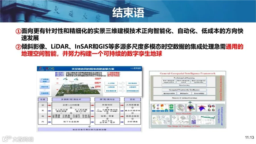 在报告中,朱庆专家从数字乡村、未来社区、重大基础设施智能建造和防灾减灾等典型案例出发,介绍了实体化实景三维表达在自然资源数字孪生与精细化、精准化和智能化治理中的巨大应用潜力。他表示,面向更有针对性和精细化的实景三维建模技术正向智能化、自动化、低成本的方向快速发展;倾斜影像、LiDAR、InSAR和GIS等多源多尺度多模态时空数据的集成处理急需通用的地理空间智能,并努力构建一个可持续的数字孪生地球。