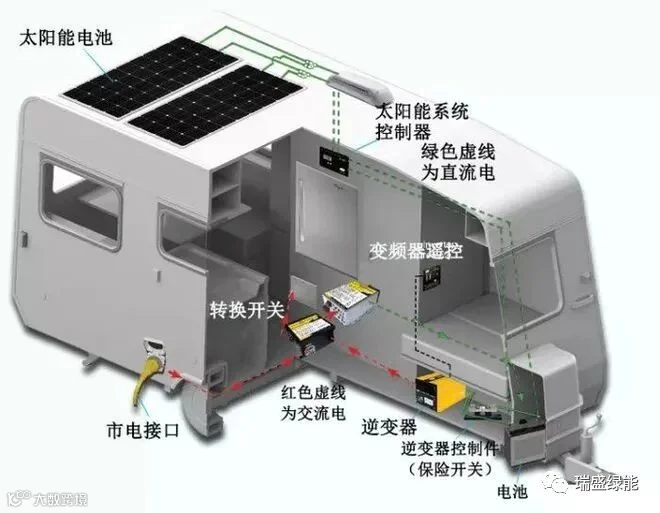 房车用电基本来自四个方面,即电池、行车发电机、外接220V电源和太阳能充电系统。