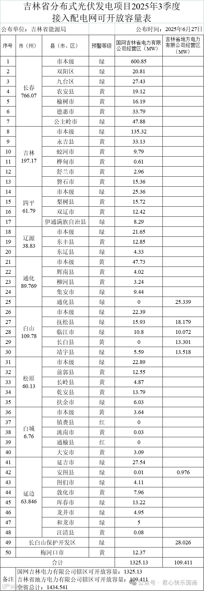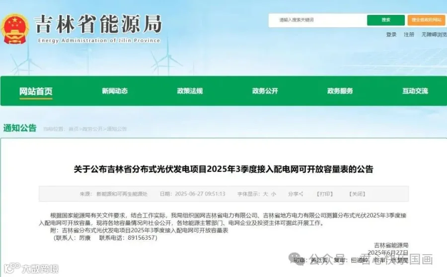 6月27日,吉林省发改委公布了《吉林省分布式发电项目2025年3季度接入配电网可开放容量表》。