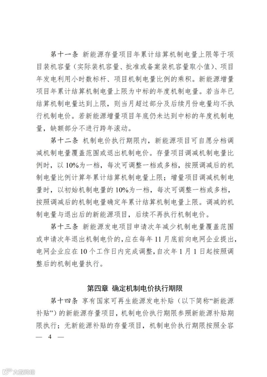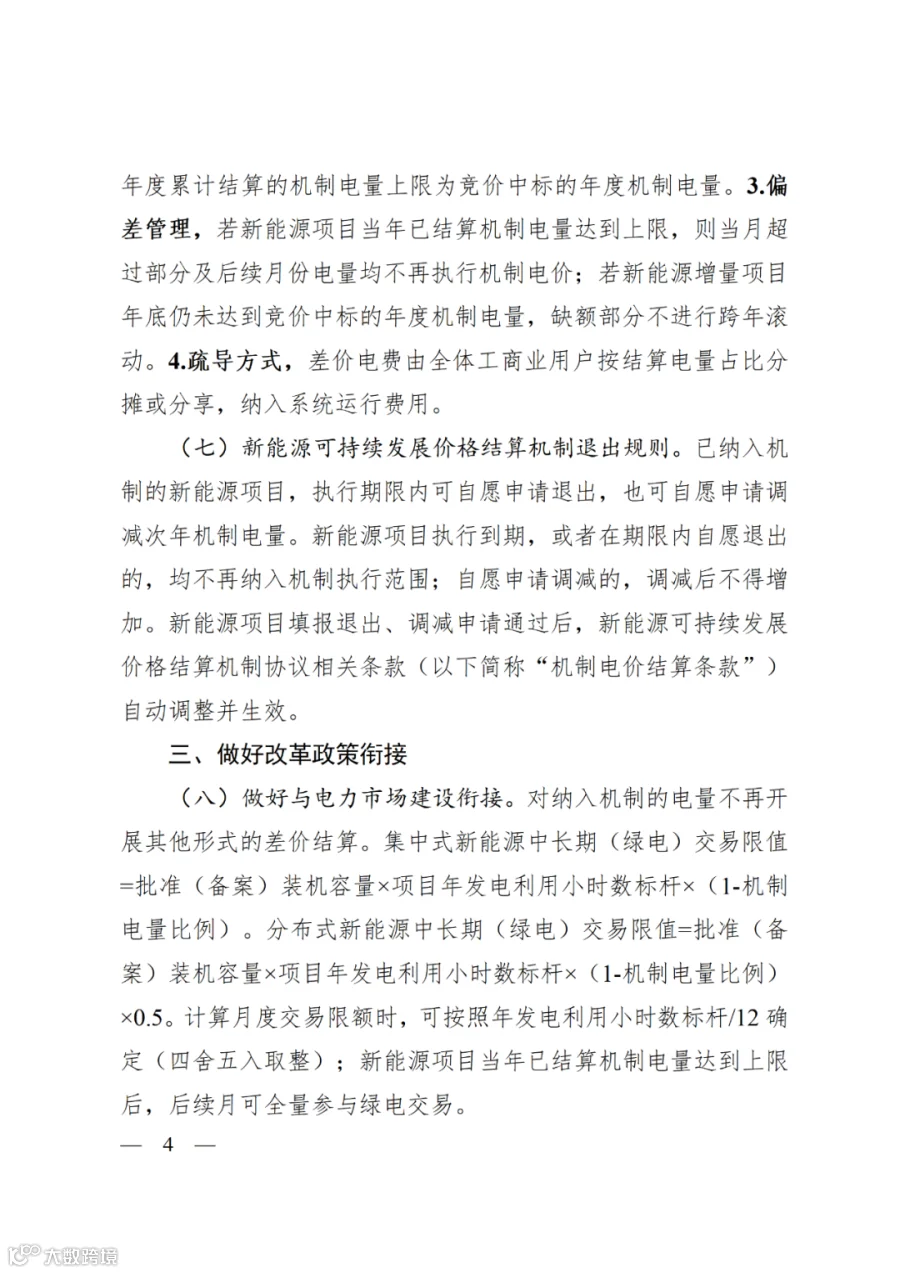 第三章为“做好改革政策衔接”。统筹衔接电力市场、绿证、代理购电、配储等现行新能源政策。一是明确新能源项目参与中长期(绿电)交易限值计算公式,当年已结算机制电量达到上限后,后续月可全量参与绿电交易。二是明确机制电量对应绿证处理方式,纳入机制的电量不重复获得绿证收益,机制电量对应绿证统一划转至省级专用绿证账户。三是明确代理购电政策、新能源政策衔接,落实新能源项目不得强制配储、完善新能源利用率统计与考核、继续执行财政补贴政策等要求。
