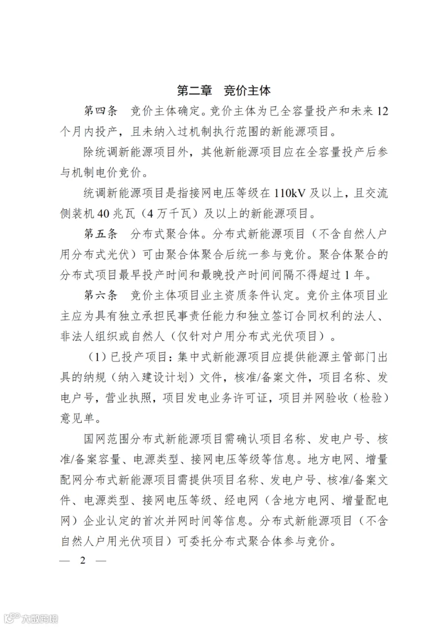 第一章为“推动新能源全面进入电力市场”。一是明确新能源项目(风电、光伏,下同)上网电量全部全面参与现货市场。统调新能源以“报量报价”参与现货市场,其他新能源暂作为价格接受者参与现货市场。二是有序参与中长期市场,各类新能源项目通过绿电交易形式参与中长期交易。三是健全电力辅助服务市场,现货市场正式运行期间,新能源项目不再承担调频、备用等辅助服务市场费用。