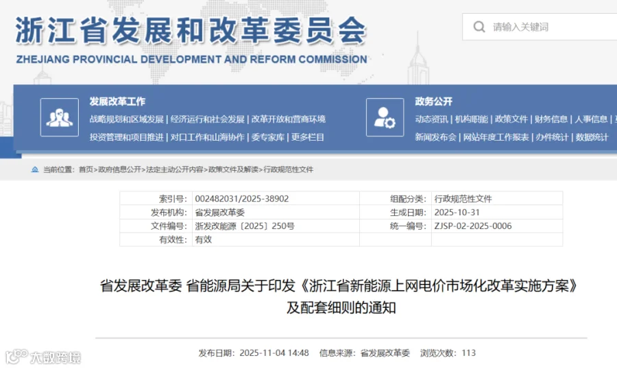 11月4日,浙江省发展改革委 浙江省能源局发布关于印发《浙江省新能源上网电价市场化改革实施方案》及配套细则的通知。